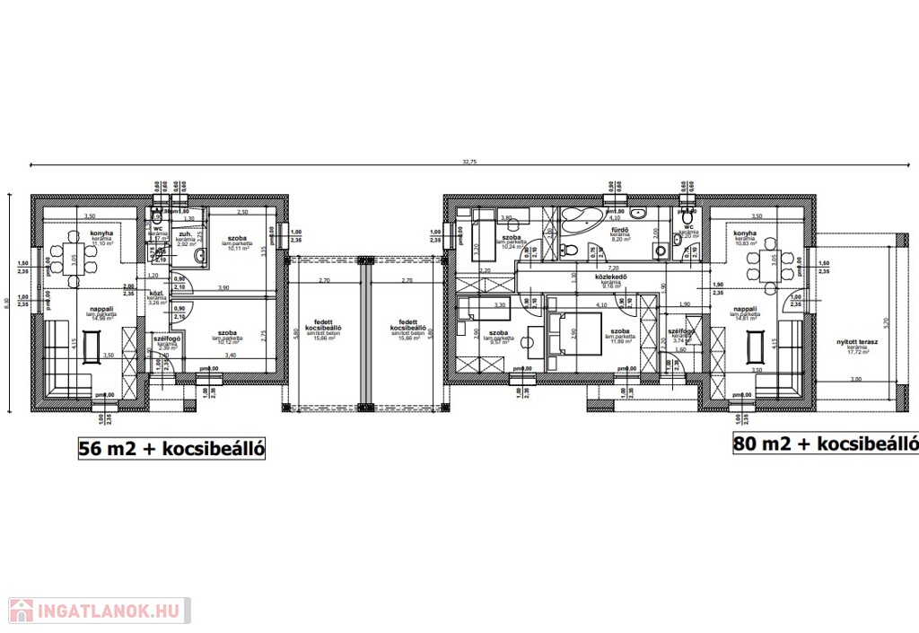 Nyíregyháza, Orosi kivezető fiatal építésű utcájában lefoglalható 2026-ban épülő iker ház mindkét oldala. Az ingatlan 80-56 m2-s, a nagyobb három fél szoba, nappali, étkező, amerikai konyha, fürdőszoba és wc egyben, külön wc és szélfogó a kisebb ház kettő fél szoba, nappali+étkező+amerikai konyha egy térben, külön zuhanyzó és wc, szélfogó tartozik hozzájuk, műanyag nyílászárós mely három rétegű üveggel ellátott, villany kazán és padlófűtésű, 30-s porotherm téglából készülnek külsőleg 15 cm-s nikecel szigetelés, belső falak kartonozva, fafödémes rajta 35 cm-s salakgyapot szigetelés a mennyezet fémvázra erősített tűzálló gipszkarton a nyereg tető beton cseréppel fedett alatta párazáró fóliával. A nagyobbik háznak 480 m2-s telekterülete van a kisebbiknek 240 m2-s, mindkettőhöz tartozik egy fedett gépkocsi beálló és térkövezett járda. KÖLTÖZNI LEGHAMARABB 2026 ÉV VÉGE.