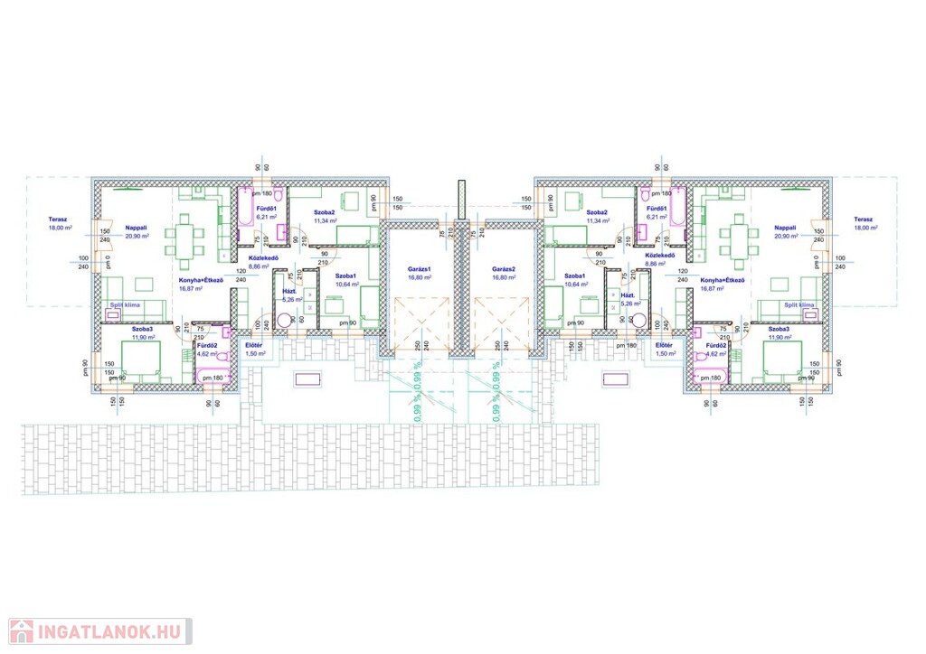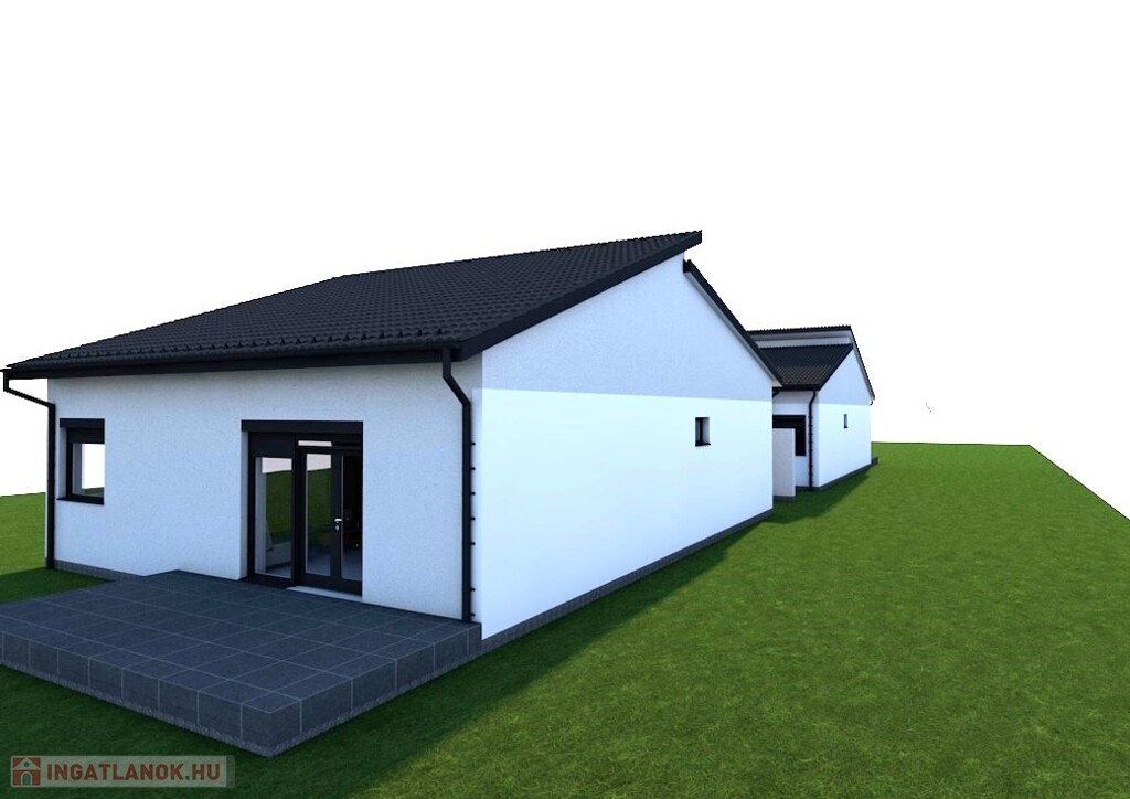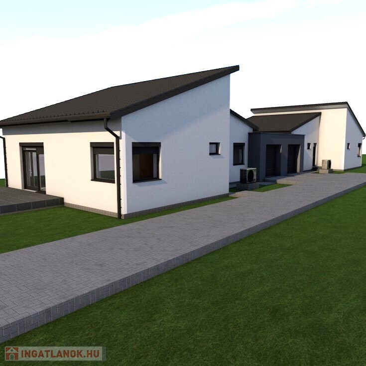 Nyírpazony-Kabaláson 2026-ba minőségi anyagokból épülő iker családi ház már foglalható. Az ingatlan alapozása monolit vasbeton sávalap, teherhordó falak 30 cm-s kerámia falazóblokk, válaszfalak 10 cm-s pórusbeton, tető szerkezet és a födém szeglemezes fa, félnyereg tetőszerkezet aminek az alsó öve egyben a zárófödém is. Külső nyílászárók 3 rétegű üvegezésű műanyag mely kívülről antracit belülről fehér színű tartozik hozzá a tokkal hasonló színű redőny és mobil szúnyogháló. Belső falak gépi vakolással végezve, glettelve, simítva. Szigetelés padlóban 12 cm-s, födémen 30 cm-s, homlokzat 15 cm-s, lábazat 15 cm-s, vízszigetelés 1 réteg bitumenes lemezszigetelés. Fűtése hőszivattyú mely padlóra vezérelt, 1 db. Split klíma 3,5 kw. meleg víz 200 L-s indirekt tartályról. A ház hasznos fűtött alapterülete 96,6 m2-s, 3 hálószoba, nappali+amerikai konyha, háztartási helység, 2 fürdőszoba+wc, továbbá tartozik hozzá 18 m2-s nyitott, burkolt terasz és 17 m2-s garázs melynek automata kapu és garázskapu bejárata van. Az árban hozzá értendő a szép kerítés és térkövezett járda és garázsfelhajtó. Az ingatlan garantáltan megbízható kivitelező által épül. Amennyiben felkeltettem az érdeklődését kérem mihamarabb hívjon!